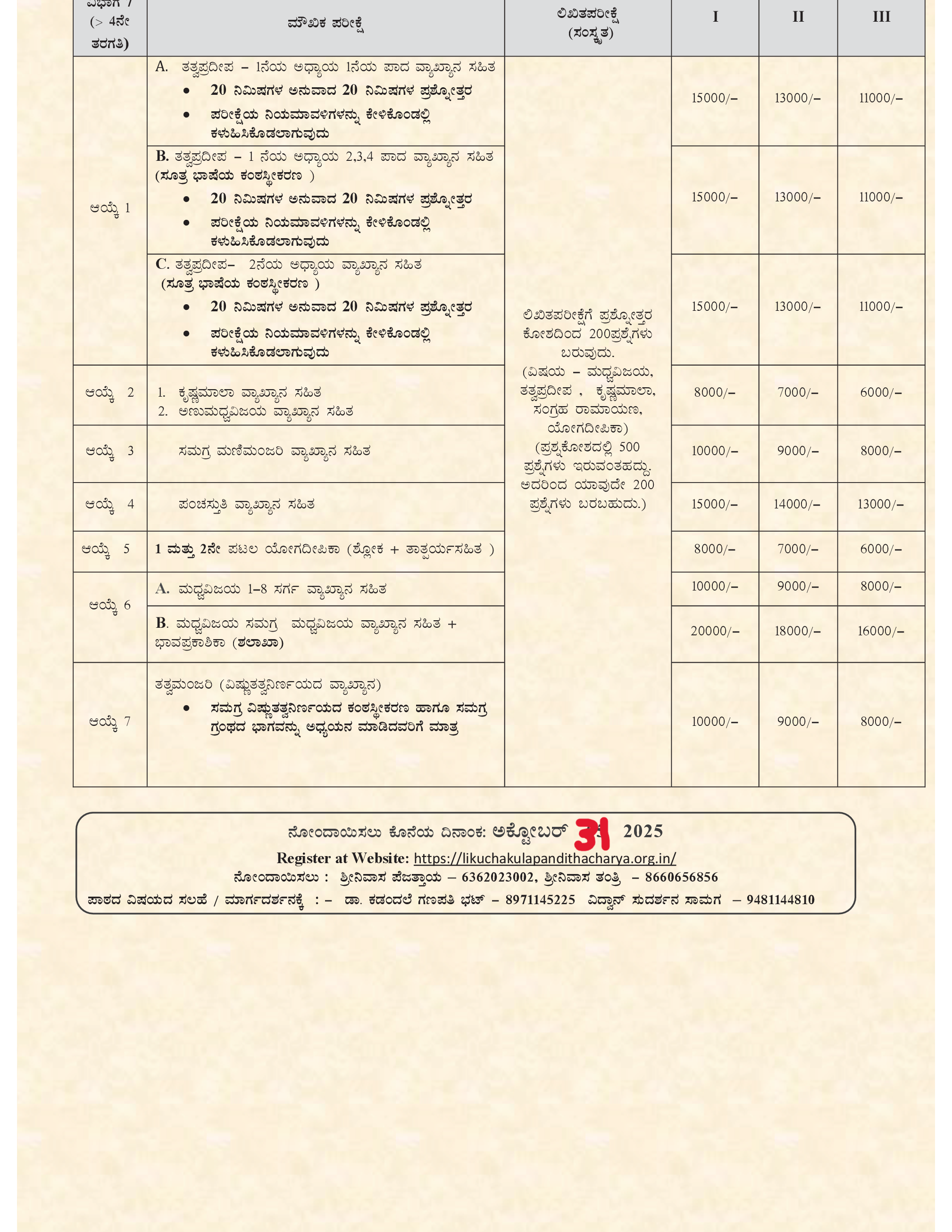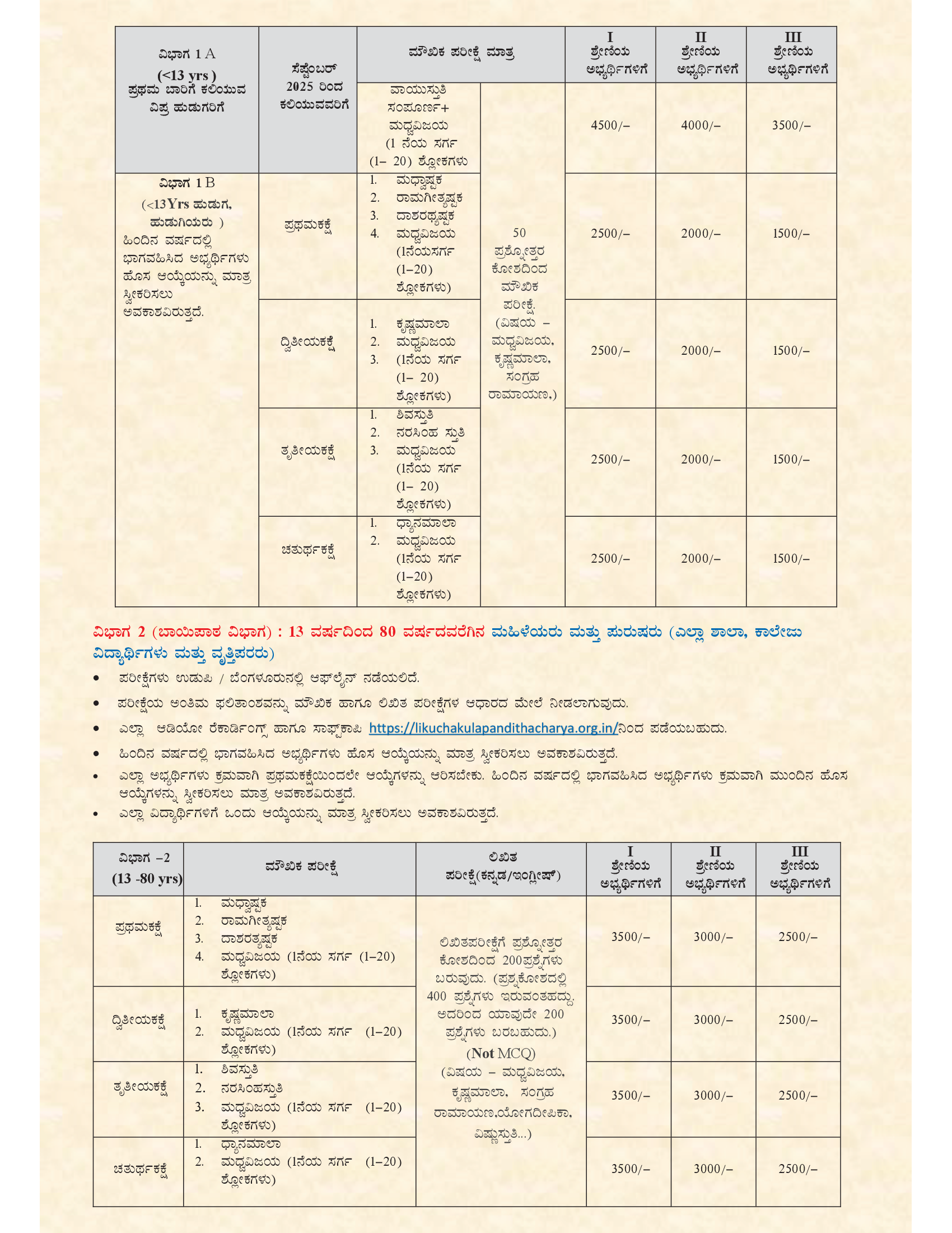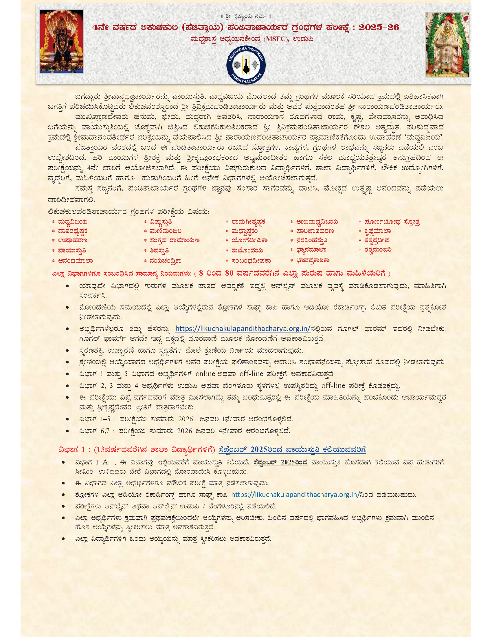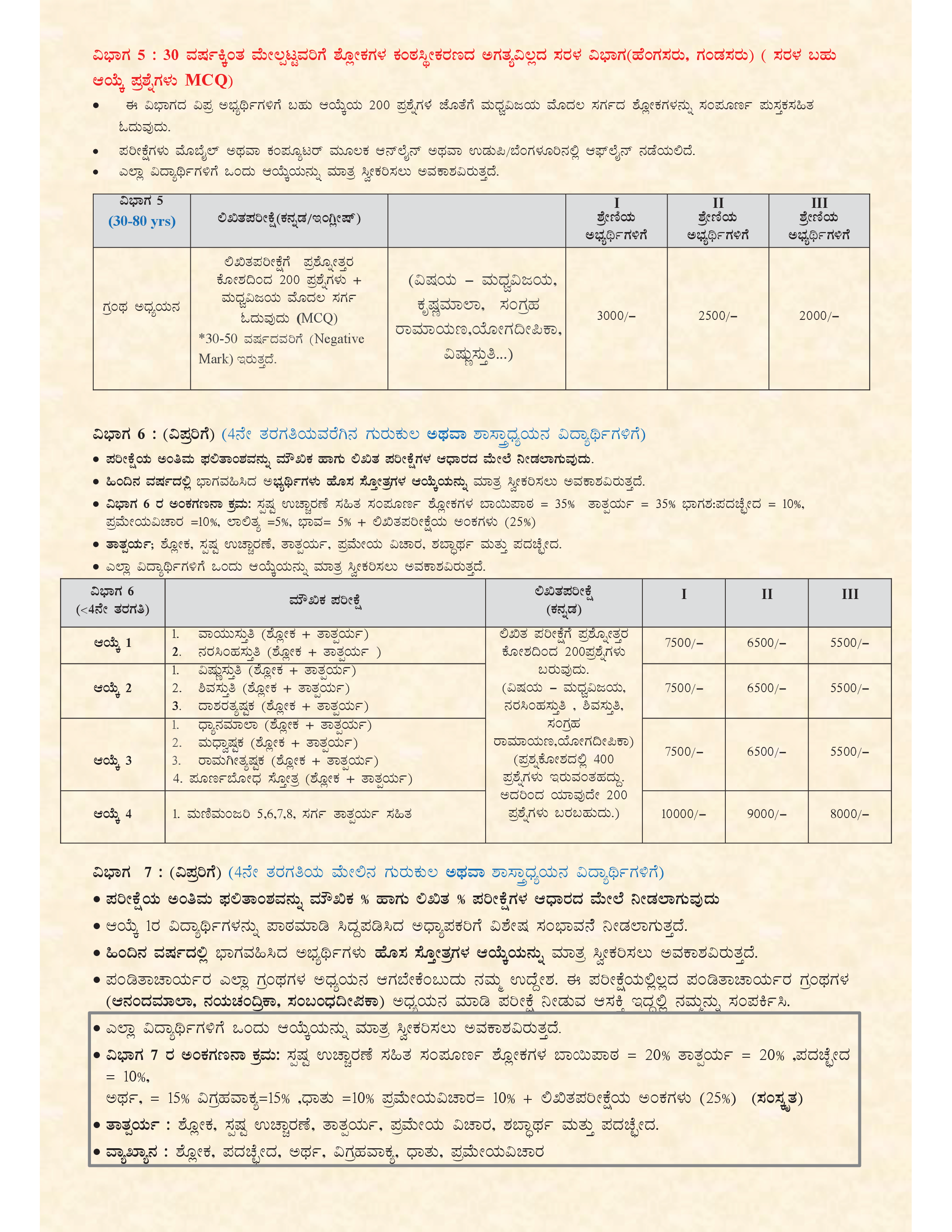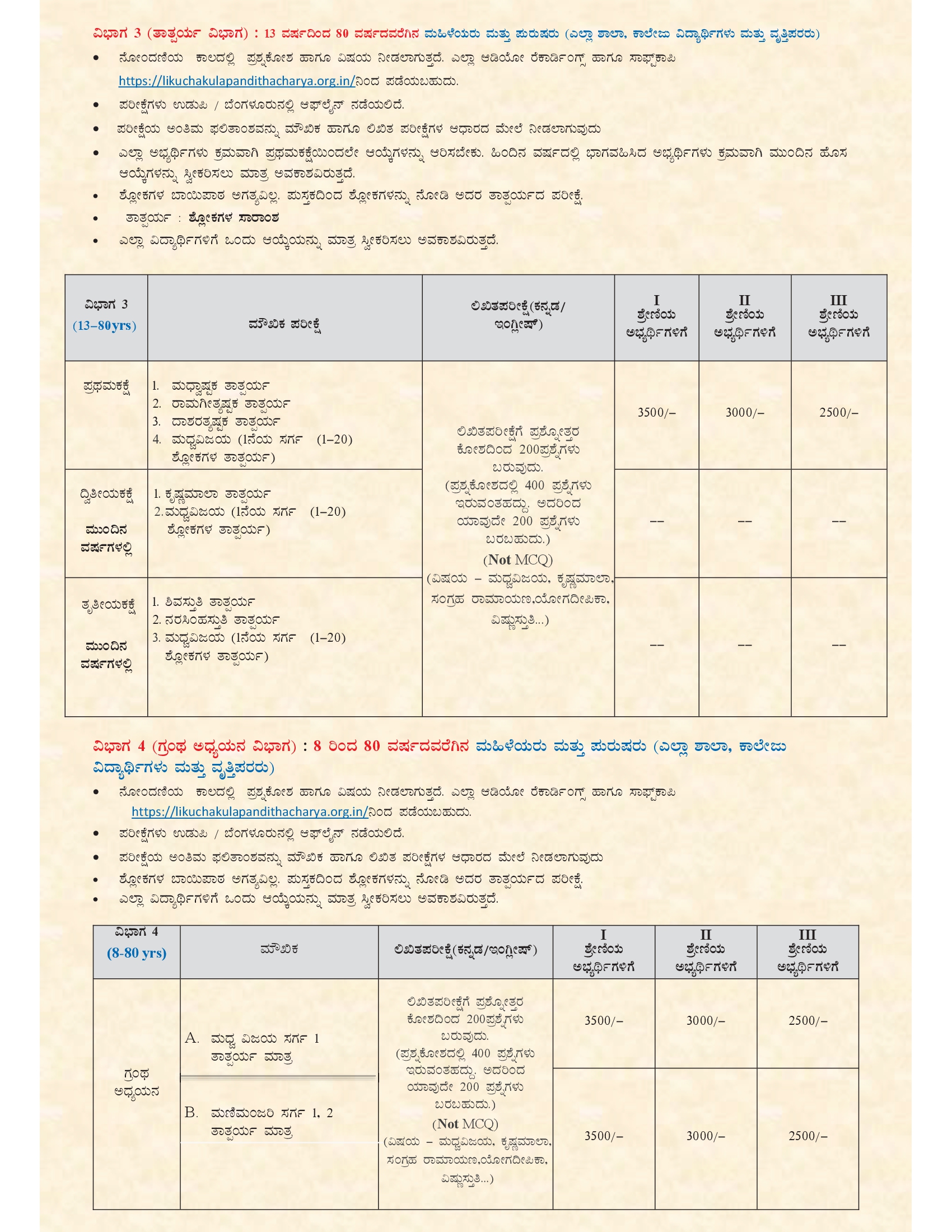 ಈ ಪರೀಕ್ಷೆಯು ವಿಪ್ರಗುರುಕುಲದ ವಿದ್ಯಾಥಿಗಳಿಗೆ, ಶಾಲಾ ವಿದ್ಯಾಥಿಗಳಿಗೆ, ಲೌಕಿಕ ಉದ್ಯೋಗಿಗಳಿಗೆ, ವೃದ್ಧರಿಗೆ, ಮಹಿಳೆಯರಿಗೆ ಹಾಗೂ ಹುಡುಗಿಯರಿಗೆ ಹೀಗೆ ಅನೇಕ ವಿಭಾಗಗಳಲ್ಲಿ ಆಯೋಜಿಸಲಾಗುತ್ತದೆ. ಸಮಸ್ತ ಸಜ್ಜನರಿಗೆ, ಪಂಡಿತಾಚಾರ್ಯರ ಗ್ರಂಥಗಳ ಜ್ಞಾನವು ಸಂಸಾರ ಸಾಗರವನ್ನು ದಾಟಿಸಿ, ಮೋಕ್ಷದ ಉತ್ಕೃಷ್ಟ ಆನಂದವನ್ನು ಪಡೆಯಲು ದಾರಿದೀಪವಾಗಲಿ.